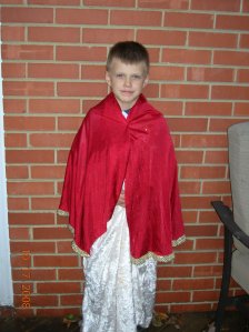 St. Martin, preparing to cut his cape in half (store bought several years ago – see Bill)