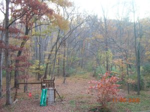 9. jen, is your playset roof leaning against the shed too?juli and barb, we got very lucky.lerin and mimi, thanks.regina, they’re all hiding behind the trees.AK, house for sale across the street.laura, at dawn, it is nice and quiet. children sleeping, neighbors drinking their coffee in their homes. we have birds singing and squirrels hunitng for nuts. The Interstate (about 400 yards away) isn’t too busy.In all honesty, now that the leaves are falling we can see lights from the apartment building through the trees and the headlights of cars on Route 395.But we heard a screech owl last night and have seen barred owls and heard them during the day. We’ve seen foxes and deer and other animals. The neighbors are quiet (and probably shake their heads at the noisy family with all the kids). It’s a nice spot.