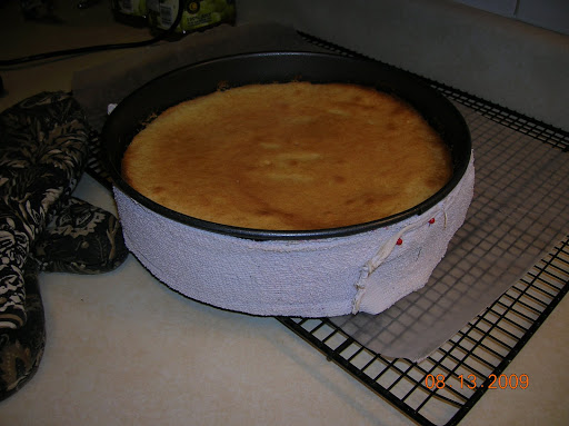 I wrapped the batter filled pans with wet toweling to keep them flat when they bake. This is an excellent trick, and I’ve saved that old cut up dish towel to do this whenever I bake a cake.