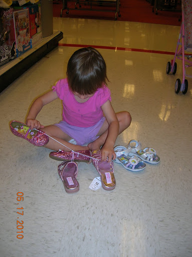 Guess who did not need new shoes? Guess who had no trouble finding plenty of shoes she wanted? We did manage to return them all to the shelves, but guess who was really disappointed when everybody had a shoe box in the car and there was none for her?