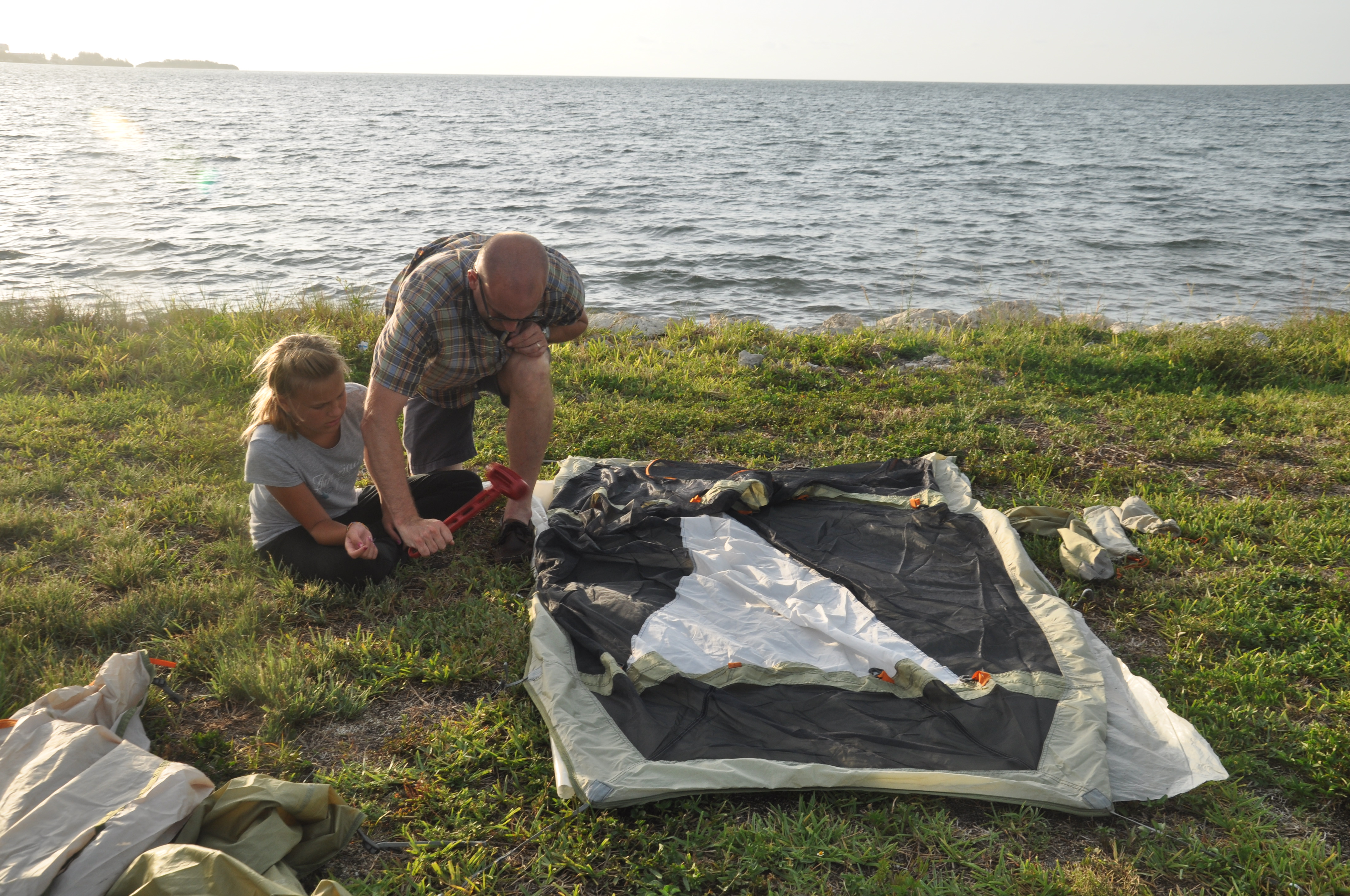 Predictably, there was dirt, there were bugs, and it was hot and sticky. Also, predictably for this time of year in Florida, there were thunderstorms. As we pitched tents, Fritz looked over at the two other groups of tents and wondered about the tarps: extra thick plastic strapped on with bungee cords. The next day, Bill walked over and noticed the tent stakes that looked like railroad spikes. That first night, we learned why.