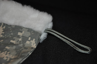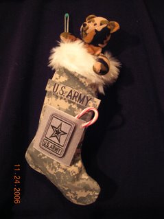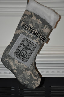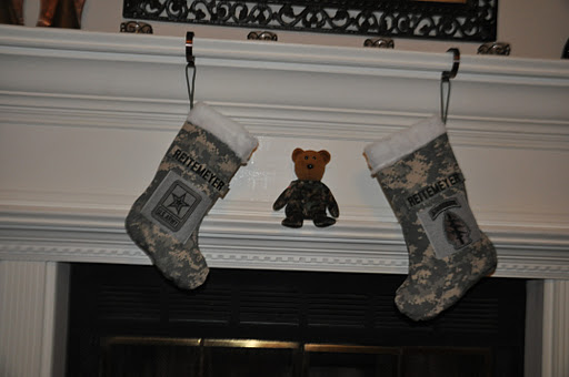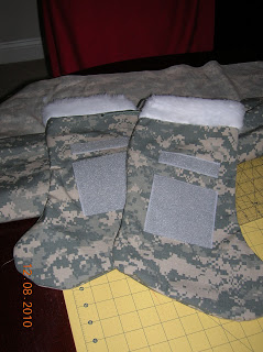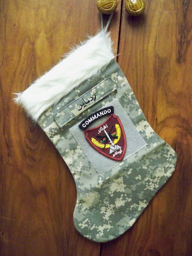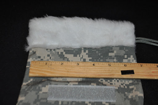 There are two pieces of velcro on the stockings. One is perfect for the name tape and the other is the right size for unit patches. I do not include name tapes and patches, unless you want REITEMEYER on your stocking. If you are sending this to a soldier overseas and do not have access to name tapes and unit patches, don’t fret. Soldiers usually have extras, or they go and get their name in Pashtu to decorate their Army Christmas stocking.