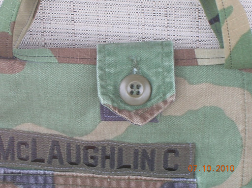 The last detail is this extra fabric, unaligned-to-anything stitch running in an arc on the side. What is it doing there? Well, that’s the way the pants are made. That fabric is where the seat of the pants begins to curve around (this would have been the right back pocket). My husband asked me if I was going to remove the fabric. I could have, but then it wouldn’t have this quirky extra-fabric-unaligned-stitching-unique-to-my-bag-because-it’s-made-from-a- real-uniform look.